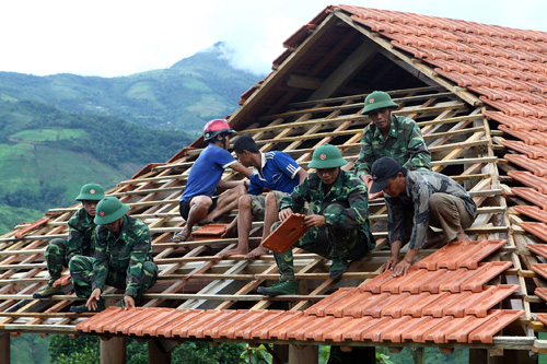 Bộ đội Biên phòng đồn Mường Muôn giúp dân xây dựng nhà mới. |