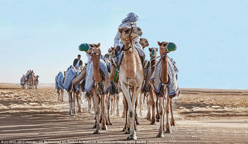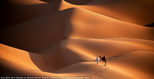 Một người đàn ông dắt theo một chú lạc đà đi qua những đụn cát.