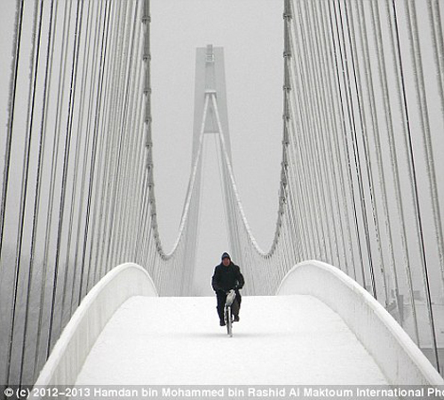 Người đàn ông băng qua cây cầu tuyết trắng.