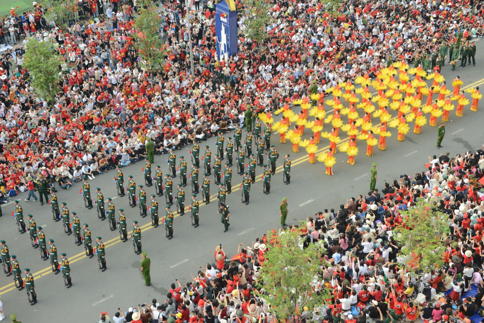 Từ trên cao, khối diễu binh trong Lễ kỷ niệm 50 năm Ngày Giải phóng miền Nam hiện lên như một bức tranh sống động, hòa quyện giữa màu sắc rực rỡ của trang phục, cờ hoa và nhịp điệu mạnh mẽ của từng bước chân.