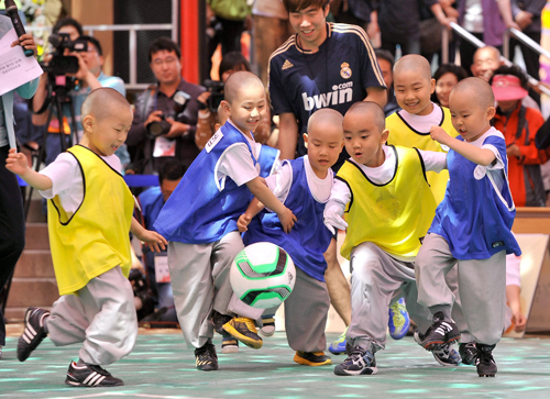 Các chú tiểu thực hiện nghi lễ trước khi tham gia vào các trận đấu bóng. |