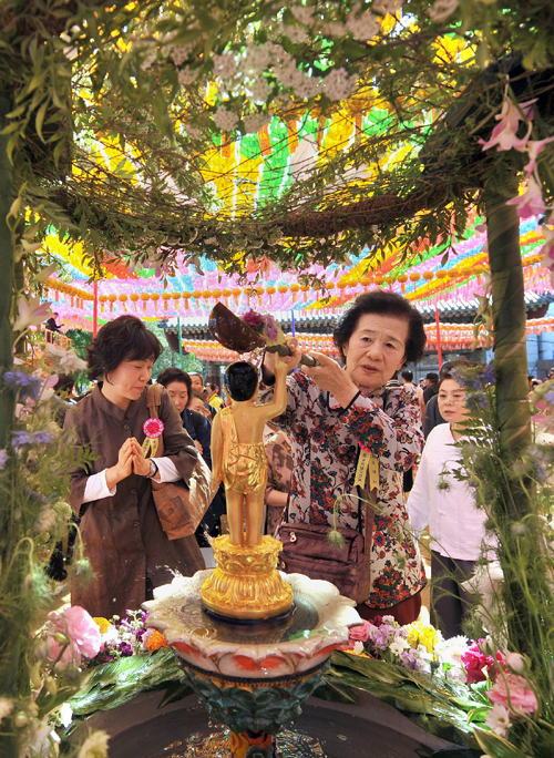 Một người theo đạo Phật tưới nước lên một bức tượng theo nghi lễ để mừng ngày sinh của đức Phật tại ngôi đền Jogye.