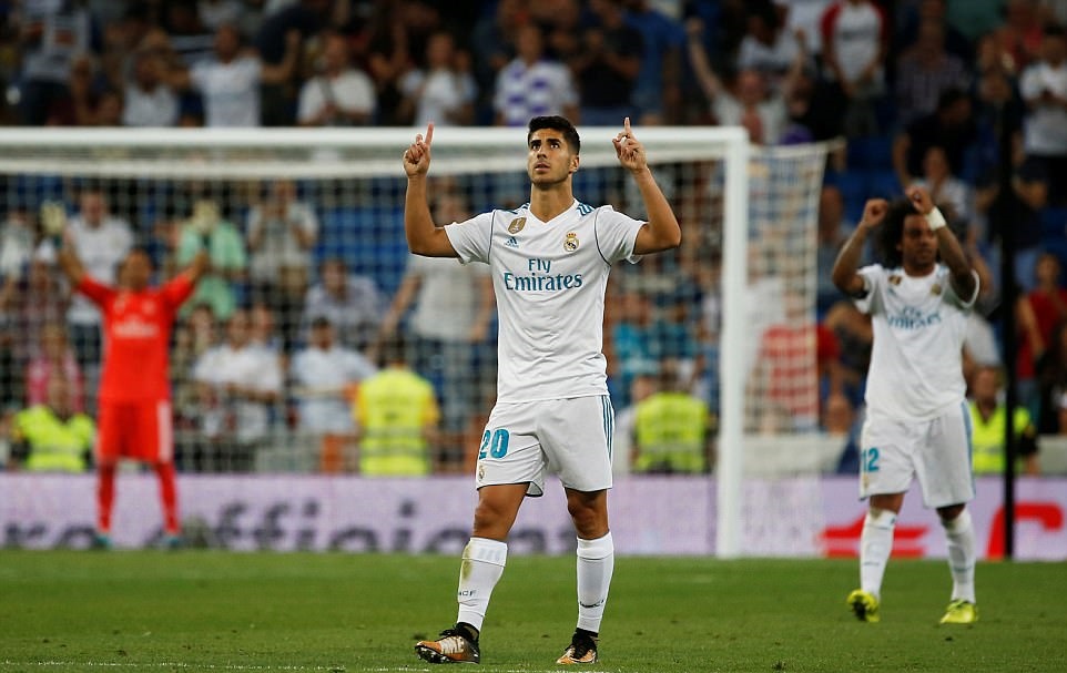 Marco Asensio vui mừng sau khi sút xa ghi bàn cho đội chủ nhà. Ảnh: Reuters |