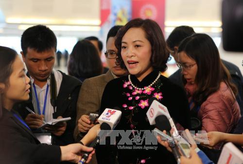 Đồng chí Nguyễn Thị Thanh, Bí thư Tỉnh ủy Ninh Bình, trả lời phỏng vấn TTXVN và các cơ quan báo chí. Ảnh: TTXVN