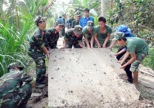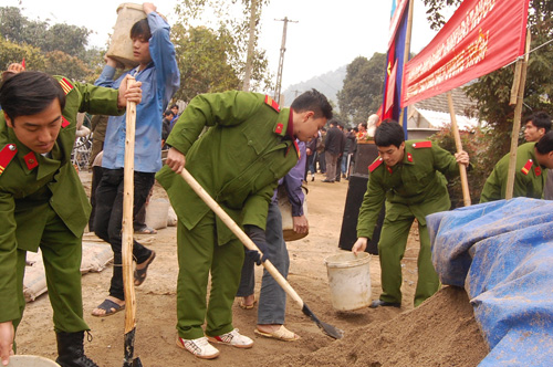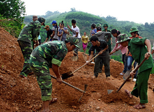 Thanh niên lực lượng vũ trang giúp dân sửa chữa đường làng. |