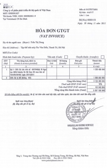 Cũng theo những thông tin bà Vũ Thúy Diễm cung cấp trong buổi làm việc với phóng viên thì sau khi thu đủ số tiền đợt 1 của bà Dung là 3.257.100.848 đồng, Công ty VIDC đã viết hóa đơn giá trị gia tăng cho bà Dung vào ngày 30/11/2011. Hóa đơn trên do ông Habibullah Khong Sow Kee – Tổng giám đốc Công ty VIDC thời điểm đó ký.