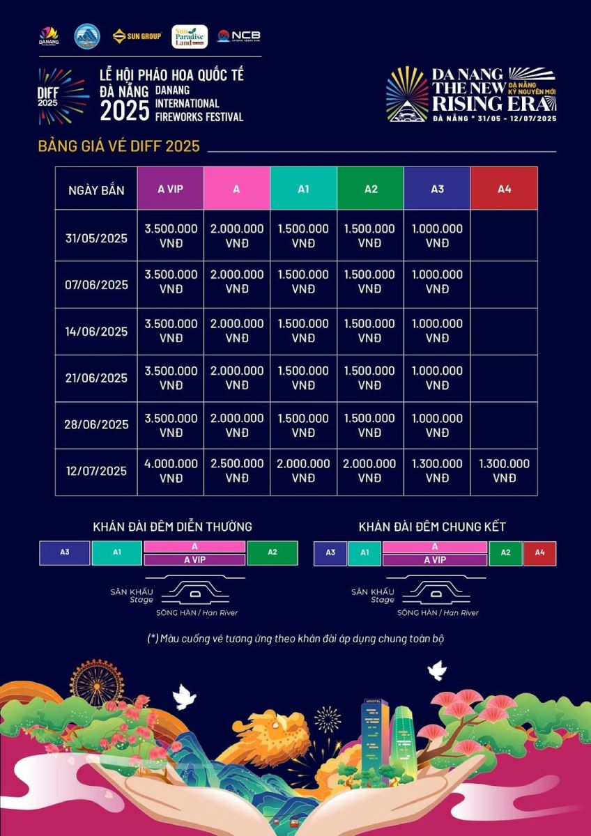 DIFF 2025 cung cấp 5 hạng vé chính: A3, A2, A1, A và A VIP – tương ứng với các khu vực khán đài dọc sông Hàn, nơi diễn ra các màn pháo hoa và chương trình biểu diễn nghệ thuật.