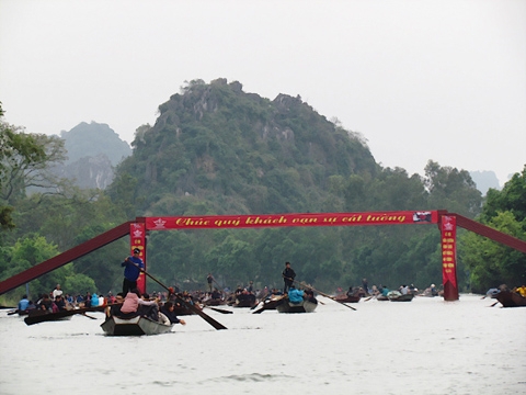 Hàng ngàn chiếc đò nườm nượp qua lại trên suối Yến. |