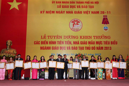 Ngày 14/11, đông đảo các thầy cô giáo tại Thủ đô đã về dự lễ tuyên dương khen thưởng các điển hình tiên tiến, nhà giáo mẫu mực tiêu biểu năm học 2012-2013, do Sở Giáo dục và Đào tạo Hà Nội tổ chức.