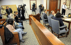 Brown nói chuyện với luật sư trong phiên tòa. Gia đình Brown ngồi bên trái. |