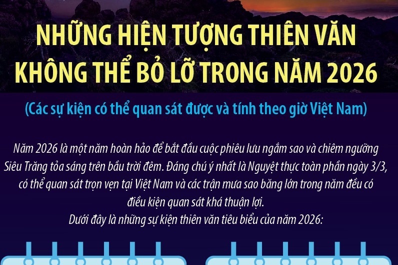 Năm 2026, những người yêu thích bầu trời có thể chiêm ngưỡng một loạt các sự kiện thiên văn tuyệt đẹp như: ba lần siêu Trăng, một nguyệt thực toàn phần quan sát trọn vẹn tại Việt Nam, cùng hàng loạt trận mưa sao băng ngoạn mục như Quadrantids, Lyrids, Perseids hay Geminids.