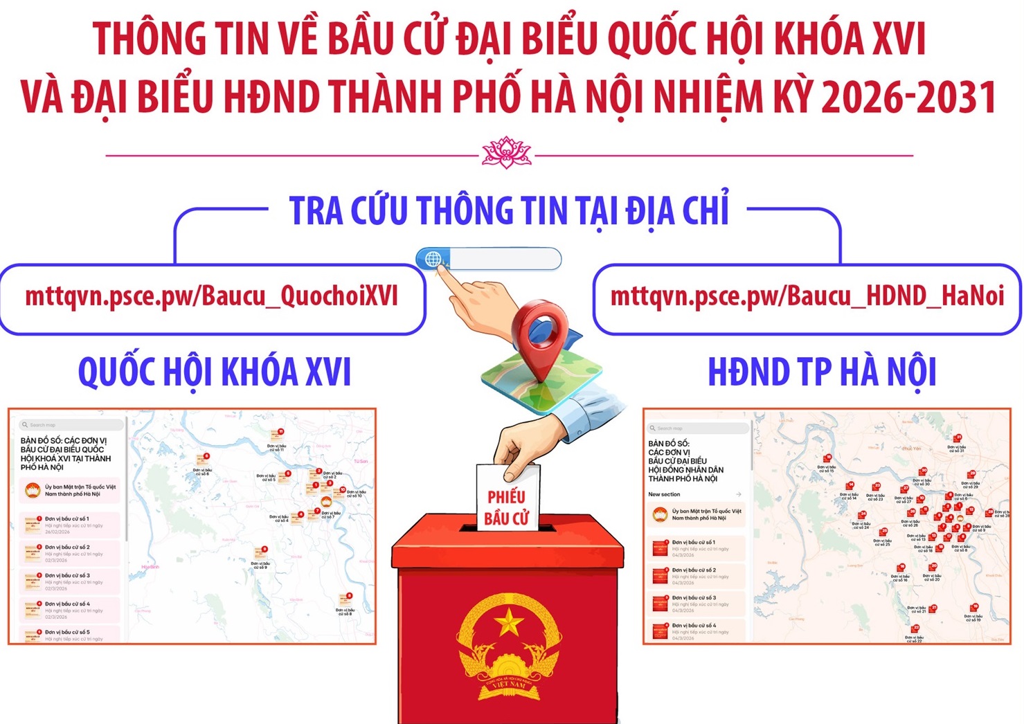 Nhằm đẩy mạnh tuyên truyền và ứng dụng chuyển đổi số trong công tác bầu cử, Ủy ban MTTQ Việt Nam TP Hà Nội giới thiệu “Bản đồ số thông tin về bầu cử đại biểu Quốc hội khóa XVI và đại biểu HĐND thành phố Hà Nội nhiệm kỳ 2026-2031”. Bản đồ số góp phần đẩy mạnh ứng dụng công nghệ thông tin và chuyển đổi số trong công tác phục vụ cử tri trên địa bàn.