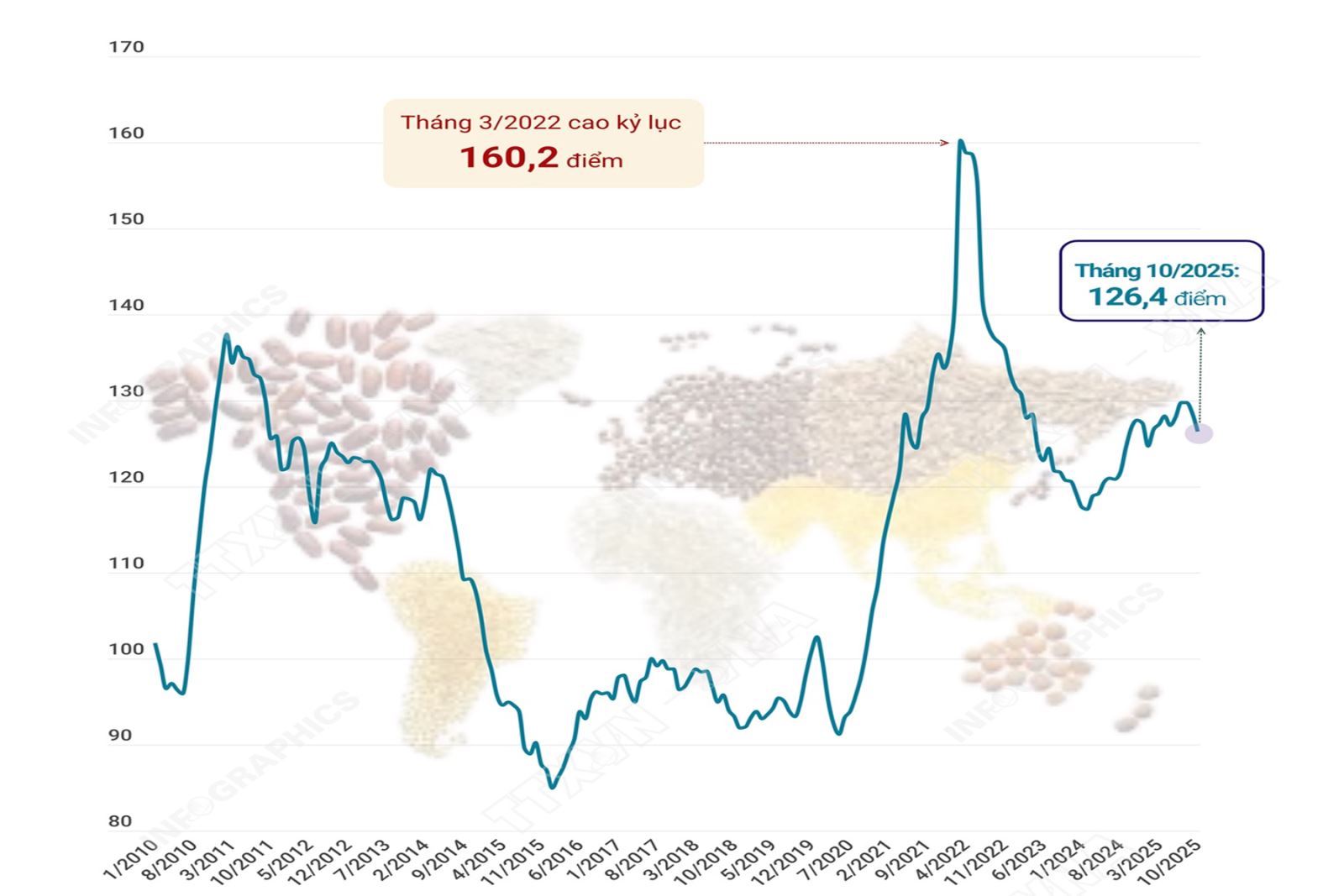 Ngày 7/11, Tổ chức Lương thực và Nông nghiệp Liên hợp quốc (FAO) cho biết giá hàng hóa lương thực thế giới trong tháng 10/2025 tiếp tục giảm, đánh dấu tháng giảm thứ hai liên tiếp. Cụ thể, Chỉ số giá lương thực đạt trung bình 126,4 điểm trong tháng 10/2025, giảm 2,1 điểm so với tháng 9 sau khi điều chỉnh (chí số tháng 9/2025 là 128,5 điểm). Chỉ số này thấp hơn 21,1% so với mức đỉnh điểm vào tháng 3/2022.(đọc thêm)
