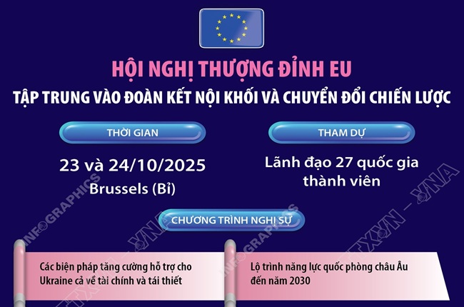 Hội nghị Thượng đỉnh Liên minh châu Âu (EU) diễn ra trong hai ngày 23 và 24/10/2025 tại Brussels (Bỉ), quy tụ lãnh đạo 27 quốc gia thành viên, nhằm thảo luận những vấn đề trọng tâm hiện nay. (đọc thêm)