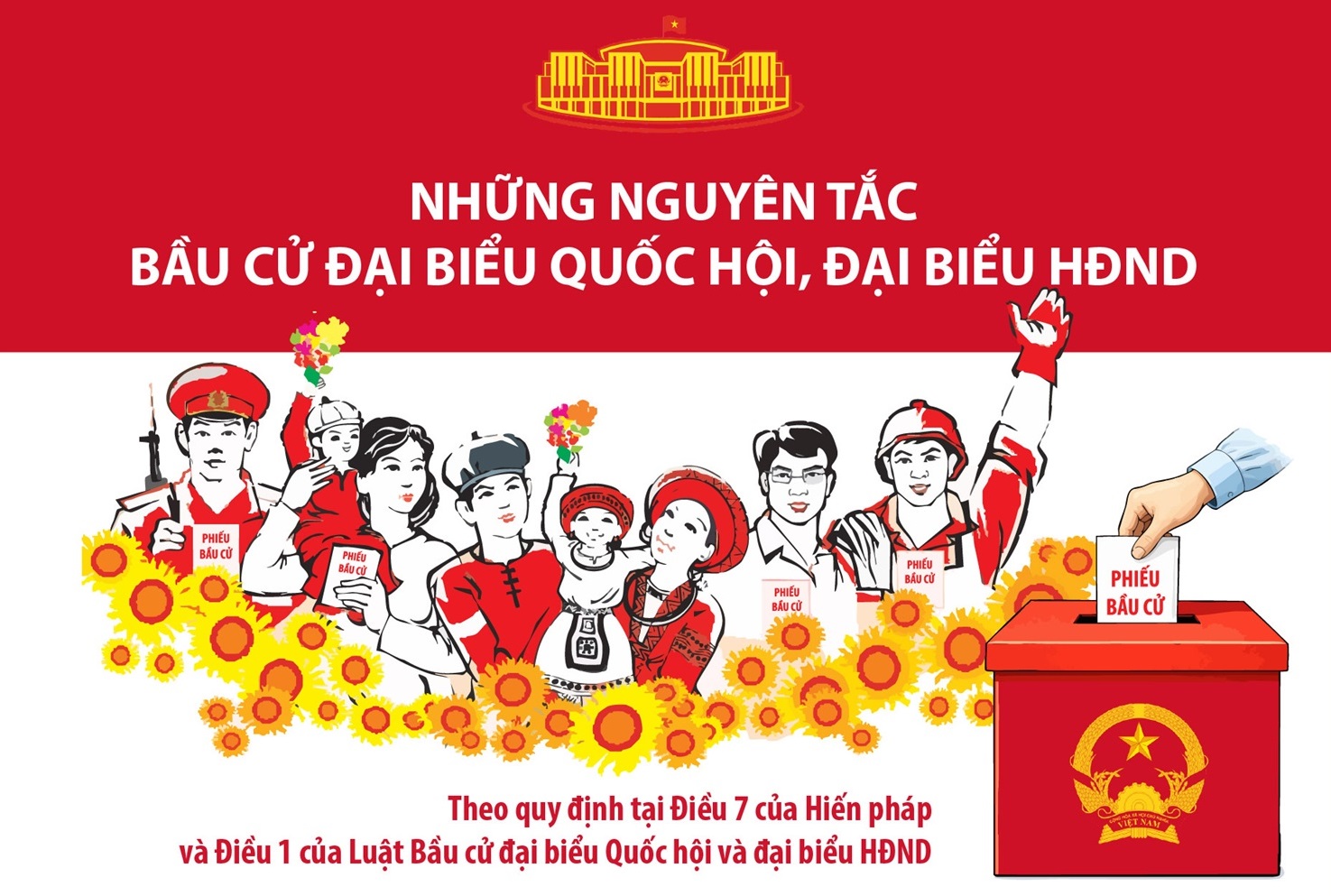 Theo quy định tại Điều 7 của Hiến pháp và Điều 1 của Luật Bầu cử đại biểu Quốc hội và đại biểu Hội đồng nhân dân (HĐND), việc bầu cử đại biểu Quốc hội và đại biểu HĐND được tiến hành theo các nguyên tắc sau đây: Nguyên tắc bầu cử phổ thông; Nguyên tắc bình đẳng; Nguyên tắc bầu cử trực tiếp; Nguyên tắc bỏ phiếu kín.(đọc thêm)