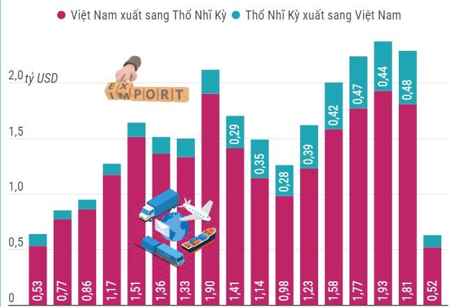 Liên tục trong nhiều năm, Thổ Nhĩ Kỳ là đối tác thương mại phi dầu mỏ lớn thứ 2 của Việt Nam tại Trung Đông với kim ngạch thương mại song phương năm 2025 đạt 2,3 tỷ USD. Trong 3 tháng đầu năm 2026, tổng kim ngạch thương mại giữa 2 nước đạt 0,63 tỷ USD, tương đương khoảng 28% của cả năm trước.(đọc thêm)