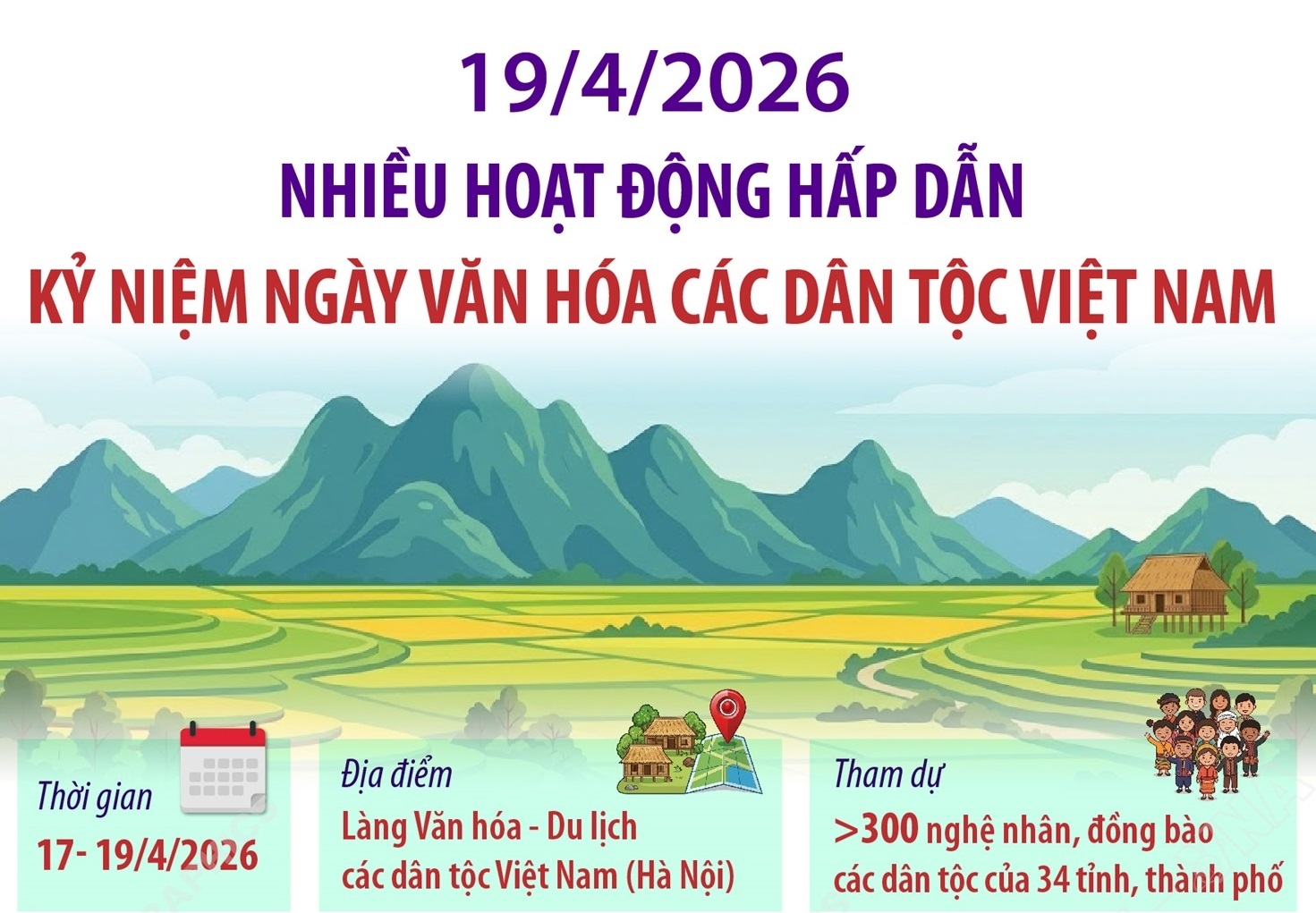 Hơn 300 nghệ nhân, già làng, trưởng bản, người có uy tín, đồng bào 54 dân tộc của 34 tỉnh, thành phố sẽ tham gia Ngày Văn hóa các dân tộc Việt Nam, diễn ra từ ngày 17 - 19/4/2026 tại Làng Văn hóa - Du lịch các dân tộc Việt Nam (xã Đoài Phương, thành phố Hà Nội). (đọc thêm)