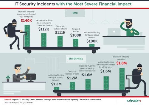 Cụ thể, năm 2017 các doanh nghiệp vừa và nhỏ đã chi trả trung bình 87.800 USD cho mỗi sự cố bảo mật, trong khi các doanh nghiệp lớn phải đối mặt với mức 992.000 USD cho một sự cố. Với các tổ chức công nghiệp, bảo mật CNTT thiếu hiệu quả gây tiêu tốn chi phí lên tới 497.000 USD một năm từ các sự cố CNTT.