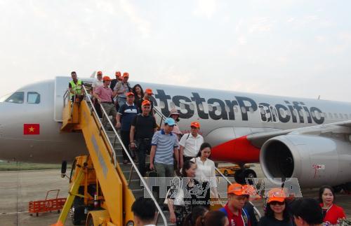 Chuyến bay Cát Bi – Đồng Hới đáp xuống cảng hàng không Đồng Hới của Jetstar Pacific. Ảnh: Đức Thọ/TTXVN |