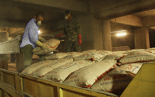 Bốc xếp xi măng tại Nhà máy Xi măng Quang Sơn - Công ty TNHH Một thành viên Xi măng Quang Sơn (Tổng công ty Xây dựng công nghiệp Việt Nam). Ảnh: Trọng Đạt - TTXVN |