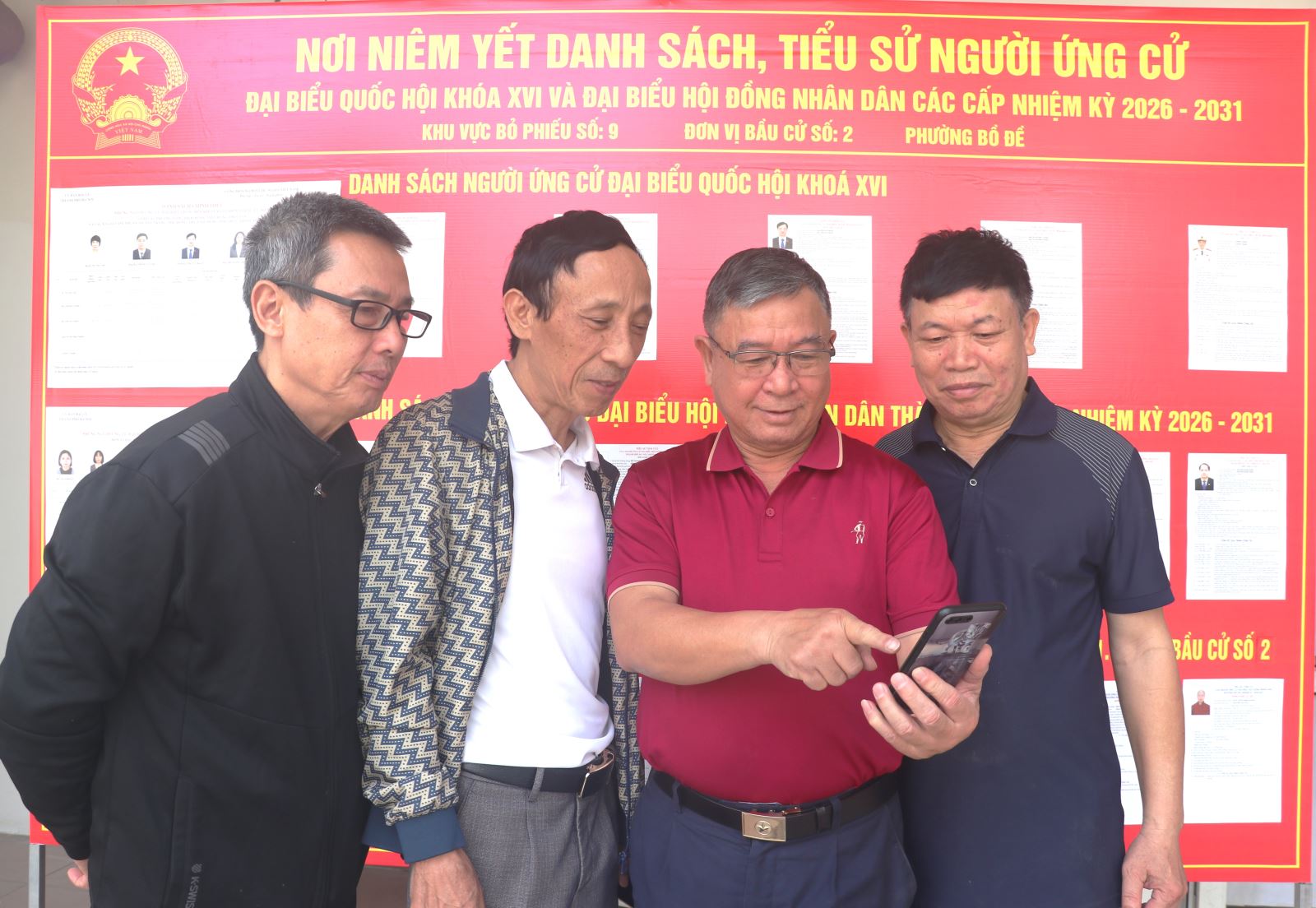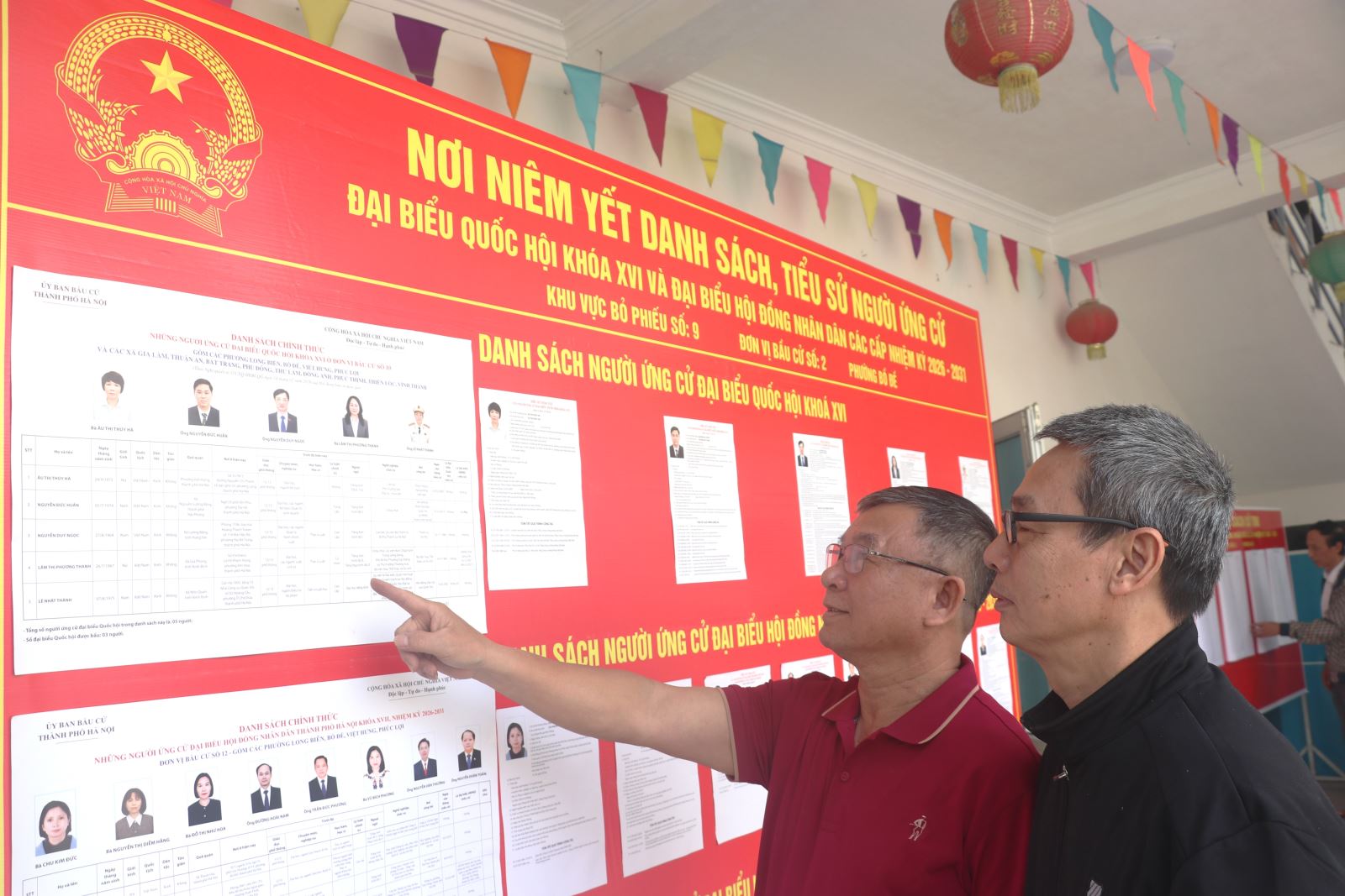 Ông Bùi Văn Hưng (áo đỏ), Bí thư Chi bộ Tổ dân phố 23, Tổ trưởng Tổ bầu cử số 9 và đồng chí Tổ trưởng Tổ dân phố 23, phường Bồ Đề (Hà Nội) kiểm tra khu vực niêm yết danh sách cử tri và tiểu sử tóm tắt người ứng cử đại biểu Quốc hội khóa XVI.