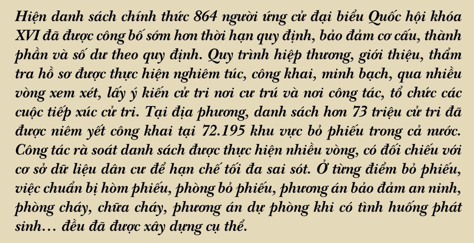 Trên cơ sở kết quả Hội nghị hiệp thương lần thứ ba, ngày 14/2/2026, HĐBCQG đã ban hành Nghị quyết số 151/NQ-HĐBCQG công bố danh sách 864 người chính thức ứng cử đại biểu Quốc hội khóa XVI ở 182 đơn vị bầu cử trong cả nước (sớm hơn 12 ngày so với quy định). Trong đó, số người ứng cử ĐBQH khóa XVI do Trung ương giới thiệu là 217 người; địa phương có 647 người, đạt tỉ lệ 1,73 người ứng cử trên 1 đại biểu được bầu; bảo đảm số dư theo quy định của Luật Bầu cử ĐBQH và đại biểu HĐND, đúng định hướng về cơ cấu, thành phần; trong đó chú trọng tỉ lệ đại biểu chuyên trách, đại biểu nữ, đại biểu là người dân tộc thiểu số.