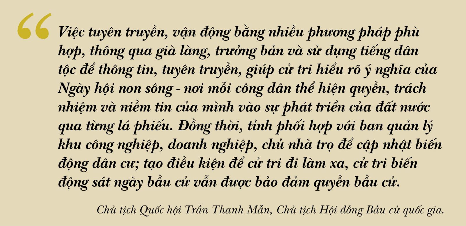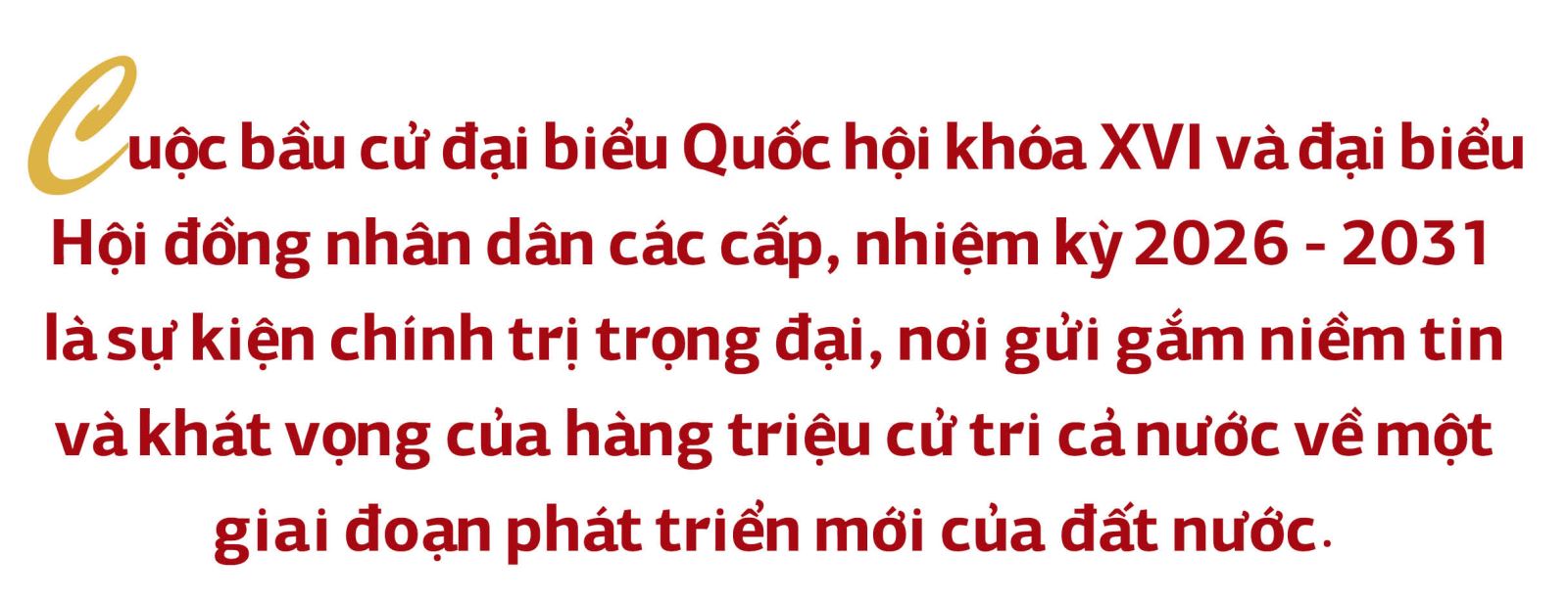 Vì vậy, cuộc bầu cử đại biểu Quốc hội khóa XVI không đơn thuần là một sự kiện chính trị định kỳ 5 năm một lần. Đây là sự kiện trọng đại để Nhân dân trực tiếp trao quyền, lựa chọn những người xứng đáng nhất đại diện cho hơn 100 triệu dân quyết định những vấn đề chiến lược của đất nước trong 5 năm tới. Thành công của cuộc bầu cử không chỉ được đo bằng tỷ lệ cử tri đi bỏ phiếu hay sự tuân thủ quy trình pháp luật, mà còn bằng chất lượng đội ngũ đại biểu được lựa chọn, những người có đủ bản lĩnh, trí tuệ và khát vọng phát triển.