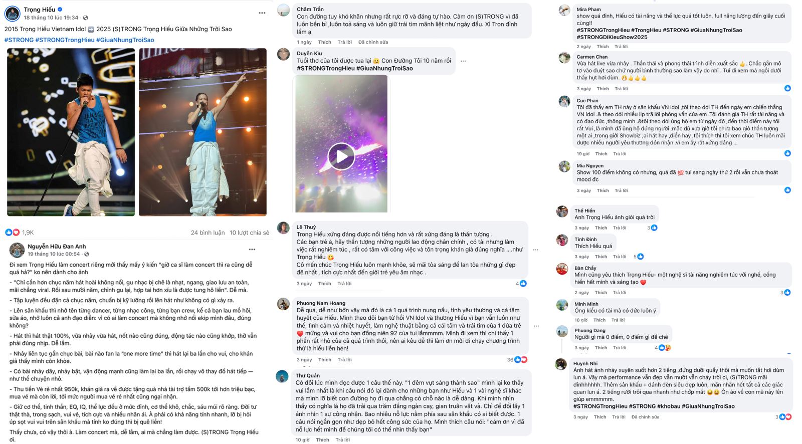 Khán giả Thuý Hiền xúc động viết: “Một liveshow bùng nổ cảm xúc, (S)TRONG đưa khán giả đi qua hành trình 10 năm sự nghiệp, từ Trọng Hiếu Idol của Vietnam Idol đến (S)TRONG Trọng Hiếu của ‘Anh trai vượt ngàn chông gai’. Cảm ơn vì đã mang đến một trải nghiệm ‘sướng tai’, đẹp mắt và đầy cảm xúc”.