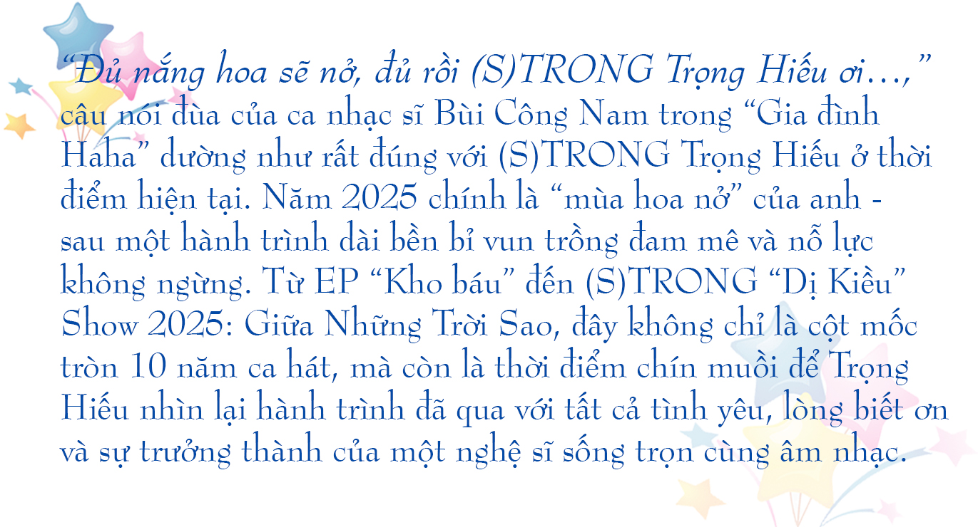Năm 2025 đánh dấu tròn 10 năm kể từ ngày (S)TRONG Trọng Hiếu đăng quang Vietnam Idol 2015, cột mốc mở ra hành trình nghệ thuật của anh. 10 năm qua, (S)TRONG đã trải qua đủ những cung bậc: Có lúc bứt phá mạnh mẽ, có khi chững lại để lắng nghe chính mình. Nhưng với anh, tất cả đều là những trải nghiệm quý giá, là chất liệu làm nên âm nhạc ngày càng thăng hoa, sâu sắc và chạm tới trái tim khán giả.