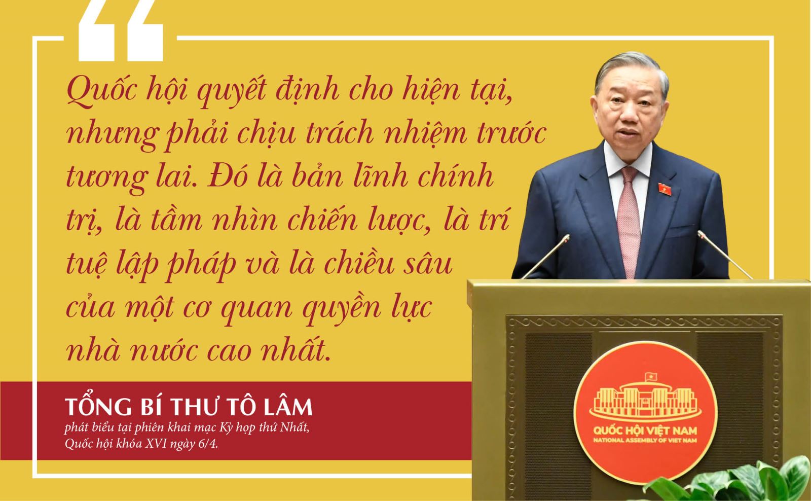 “Với truyền thống nghìn năm dựng nước, giữ nước và những giá trị di sản vĩ đại từ cha ông, với khát vọng vươn lên không ngừng, ý chí sắt đá và bản lĩnh kiên cường, với chân lý "Nước Việt Nam là một, dân tộc Việt Nam là một", với quyết tâm không thể để đất nước tụt hậu, không thể để nhân dân mất cơ hội phát triển, phải hành động vì tương lai lâu dài và tươi sáng cho dân tộc, với sự ủng hộ, giúp đỡ của bạn bè quốc tế, nhất định Việt Nam sẽ viết tiếp những chương mới rực rỡ trong hành trình phát triển, hoàn thành các mục tiêu chiến lược đã đề ra”, Tổng Bí thư, Chủ tịch nước phát biểu.