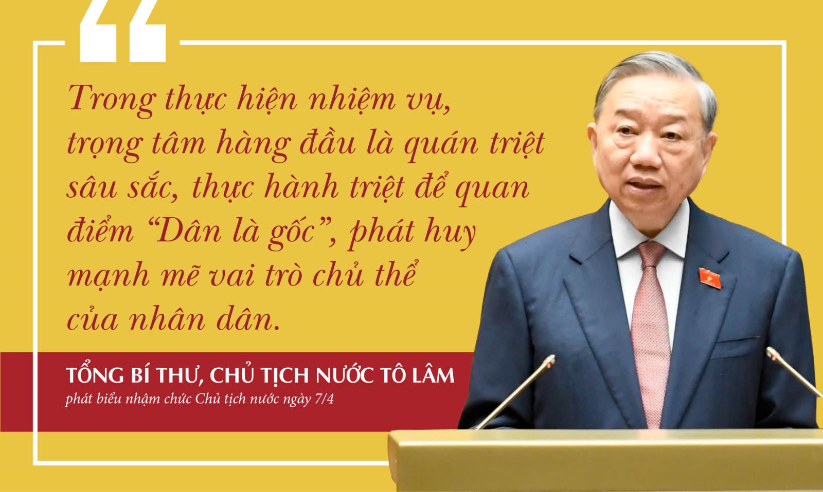 Nhiệm vụ trọng tâm hàng đầu được Tổng Bí thư Tô Lâm nhấn mạnh sau khi Quốc hội bầu làm Chủ tịch nước nhiệm kỳ 2026 - 2031 là quán triệt sâu sắc, thực hành triệt để quan điểm "Dân là gốc", phát huy mạnh mẽ vai trò chủ thể của nhân dân, huy động sức mạnh của nhân dân và khối đại đoàn kết toàn dân tộc. Mục tiêu cao nhất, đích đến cuối cùng là nhân dân được thụ hưởng thành quả của phát triển.