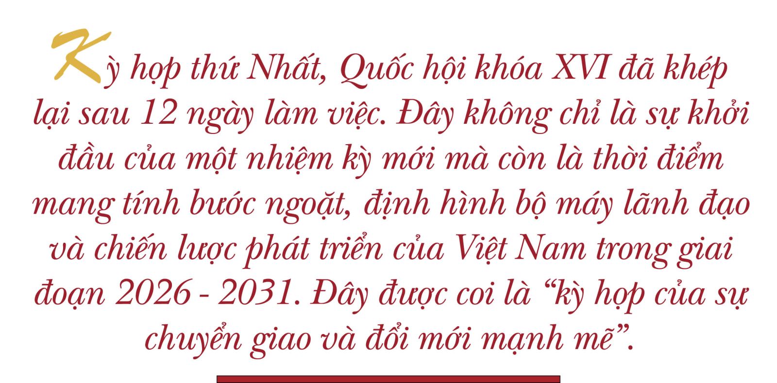 Kỳ họp đặc biệt này tập trung xem xét, quyết định cơ cấu tổ chức và bầu, phê chuẩn các chức danh lãnh đạo cấp cao của bộ máy Nhà nước, những yếu tố có ý nghĩa quyết định đối với hiệu quả hoạt động trong cả nhiệm kỳ.