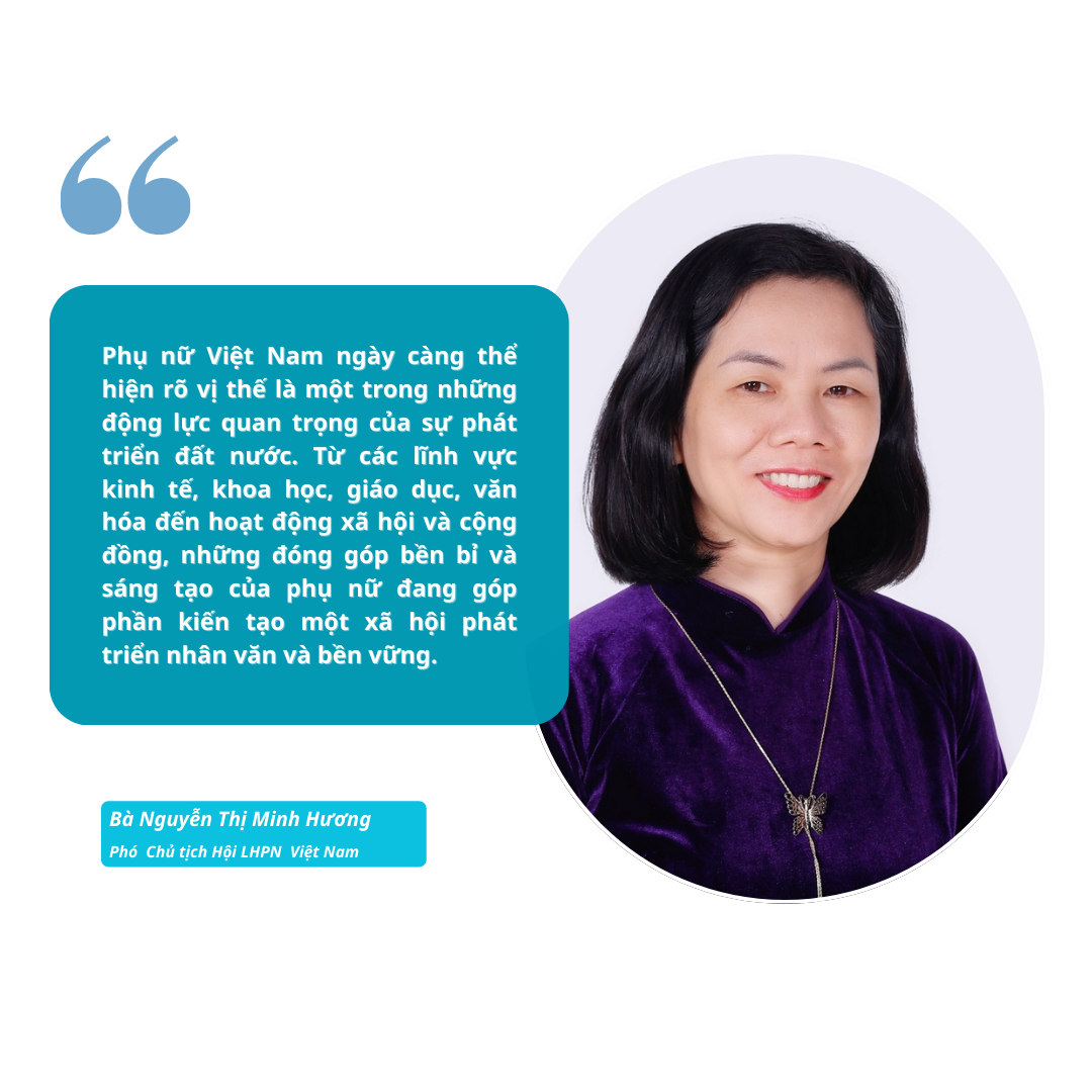 Những nữ trí thức, nữ doanh nhân, nữ công nhân, nữ nông dân, nữ văn nghệ sĩ, nữ chiến sĩ lực lượng vũ trang… tất cả làm nên diện mạo mới của đất nước. Nhiều chị đã trở thành nhà khoa học đầu ngành, nhà giáo ưu tú, bác sĩ giỏi, nhà văn, nhà báo, nghệ sĩ nhân dân, vận động viên vô địch; nhiều chị là đại biểu dân cử, lãnh đạo các cấp, cán bộ chủ chốt ở cơ sở, tham gia hoạch định và thực thi chính sách. Bức tranh phụ nữ Việt Nam hôm nay đa sắc tiêu biểu cho bản lĩnh - trí tuệ - nhân ái - sáng tạo - bền bỉ.
