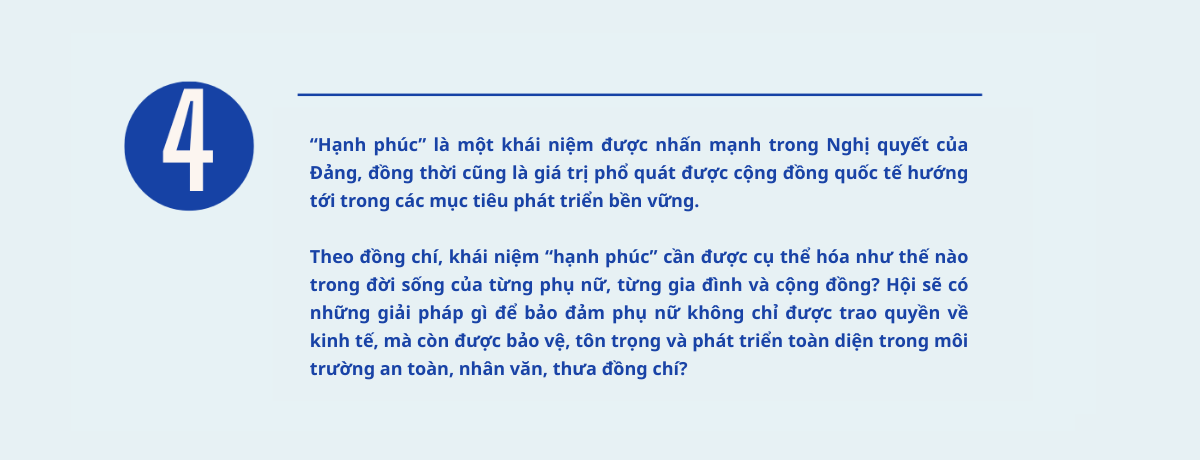 Dưới góc độ của Hội LHPN Việt Nam, “hạnh phúc” cần được cụ thể hóa bằng những điều rất thiết thực trong đời sống của mỗi phụ nữ, mỗi gia đình và cộng đồng. Đó trước hết là khi phụ nữ được sống trong môi trường an toàn, được tôn trọng, được bảo vệ, được học tập, làm việc, cống hiến và có cơ hội phát triển bình đẳng; khi phụ nữ có sức khỏe, có sinh kế ổn định, có đời sống tinh thần phong phú và có tiếng nói trong các quyết định của gia đình và xã hội.