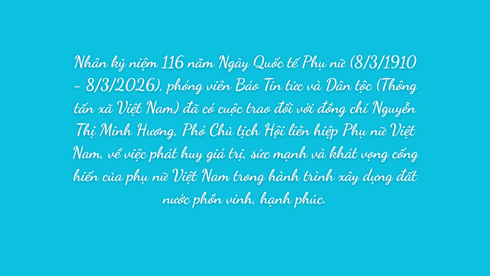 Ngày Quốc tế Phụ nữ 8/3 không chỉ là một ngày kỷ niệm mà là một cột mốc để các quốc gia cùng nhìn lại và tiếp tục hành động để đạt được bình đẳng giới thực chất. Nhân ngày 8/3, tôi chúc phụ nữ Việt Nam luôn tự tin vào giá trị và sức mạnh nội tại của chính mình; phá bỏ rào cản, định kiến để tiến đến hạnh phúc và thành công.