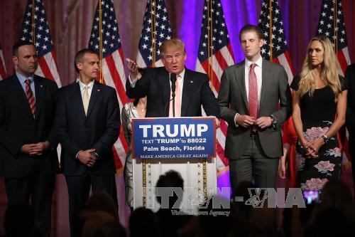 Ứng viên Donald Trump (giữa, trước) phát biểu tại cuộc họp báo tại Palm Beach, Florida ngày 15/3. Ảnh: AFP/TTXVN |