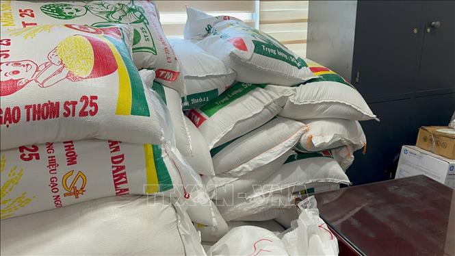 Số gạo giả thương hiệu ST25 bị lực lượng chức năng thu giữ. Ảnh: TTXVN phát
