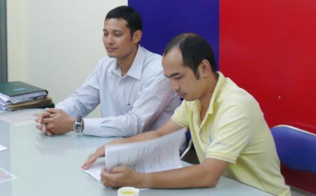 Đối tượng truy nã quốc tế Art Waylon Gill (bên trái) đang khai báo tại cơ quan Công an. |
