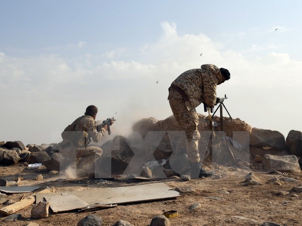 Binh sỹ Syria giao tranh với lực lượng nổi dậy tại làng Sawwan, phía nam Khanasser thuộc Aleppo. Ảnh: AFP/TTXVN |