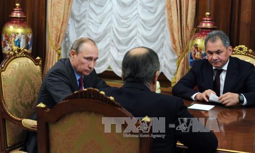 Tổng thống Nga Vladimir Putin (trái) trong cuộc họp với Bộ trưởng Quốc phòng Sergei Shoigu (phải) và Ngoại trưởng Sergei Lavrov (giữa) tại Moskva ngày 14/3. Ảnh: AFP/TTXVN |
