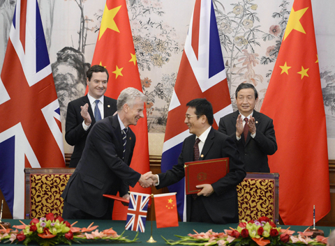 Chính phủ Anh đã cho phép các công ty Trung Quốc nắm cổ phần trong các nhà máy điện hạt nhân ở Anh. Bộ trưởng Tài chính Anh George Osborne đã đưa ra tuyên bố trên vào ngày cuối của chuyến thăm Trung Quốc 17/10 khi đến thăm một nhà máy điện nguyên tử ở Thái Sơn, tỉnh Quảng Đông.Bộ trưởng Tài chính Anh George Osborne (trái, phía sau) tại Bắc Kinh ngày 15/10. Ảnh: AFP/ TTXVN |