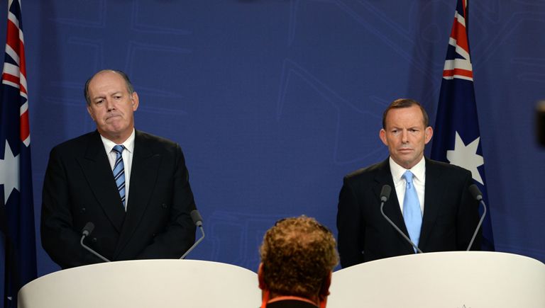 Thủ tướng Australia Tony Abbott (phải) và Bộ trưởng Quốc phòng David Johnston tại cuộc họp báo ở Sydney, ngày 16/12. Ảnh: AFP-TTXVN