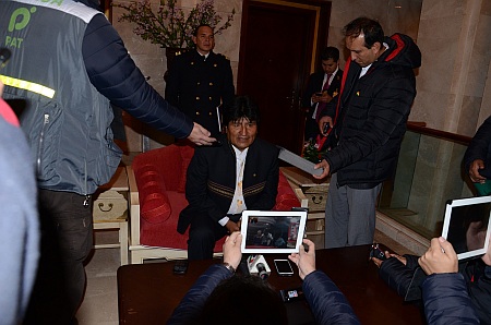 Tổng thống Morales trả lời phỏng vấn báo chí trước giờ phóng vệ tinh. Ảnh: ABI |