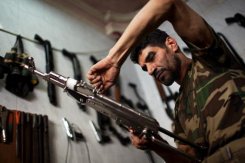 Trong lúc người dân Syria ngày càng nghèo xác xơ vì chiến tranh triền miên, thì Abu Mohammad, trùm lái súng tại tỉnh Aleppo lại phất lên nhanh chóng nhờ lượng "hàng nóng" bán được, từ các loại hàng khủng như súng phóng lựu cho đến súng đạn thông thường, thậm chí cả kiếm.Abu Mohammad đang kiểm tra một khẩu AK-47. Ảnh: AFP