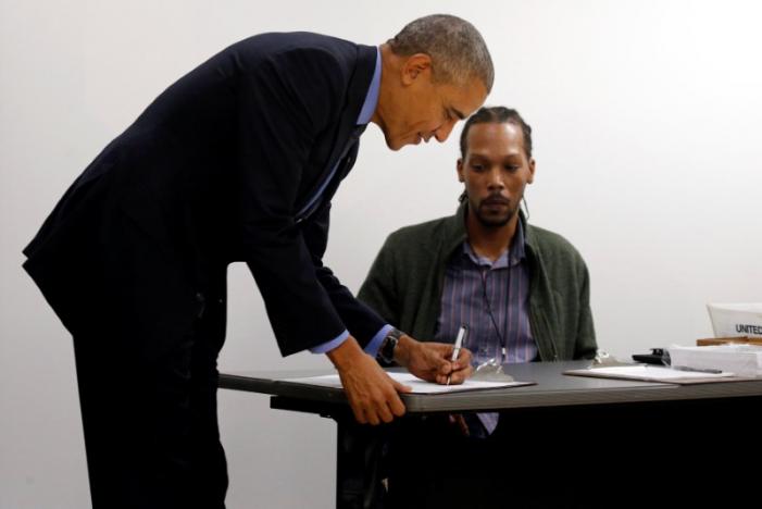 Tổng thống Obama ký tên khi đến điểm bỏ phiếu. |