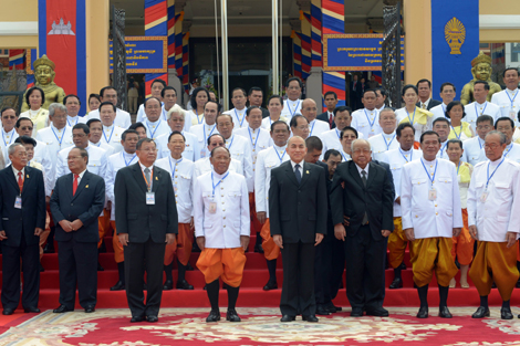 Quốc vương Campuchia Norodom Sihamoni (thứ tư, phải), Thủ tướng Hun Sen (thứ hai, phải) và các thành viên Quốc hội mới tại Phnom Penh ngày 23/9/2013. Ảnh: AFP/TTXVN |