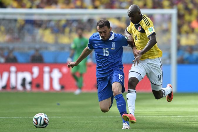 Hậu vệ Vasilis Torosidis (trái) đội tuyển Hy Lạp cản phá bóng trước tiền đạo Victor Ibarbo, đội tuyển Colombia. Ảnh: TTXVN