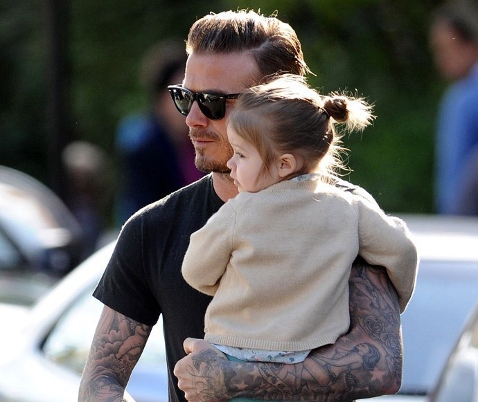 Cùng con gái Harper tại London cuối tháng 5/2013. Becks sẽ có nhiều thời gian hơn cho gia đình sau khi giã từ sự nghiệp cầu thủ |