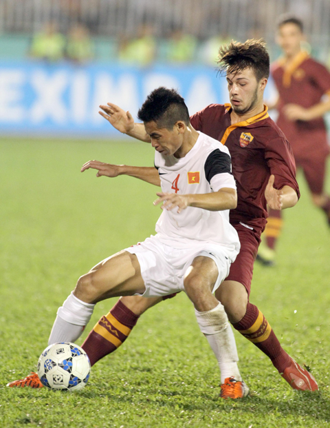 Tại sân vận động Thống Nhất (TP. Hồ Chí Minh), đội tuyển U19 Việt Nam tối 6/1 đã có trận ra quân tại Giải bóng đá U19 Quốc tế - Cúp Nutifood năm 2014. Dù đã thi đấu khá đẹp mắt, nhưng Việt Nam vẫn chịu thất bại 1 – 2 trước AS Roma. Pha tranh bóng giữa Trương Văn Thiết (4, VN) và Trani (9, AS Roma). Ảnh: Quang Nhựt - TTXVN |