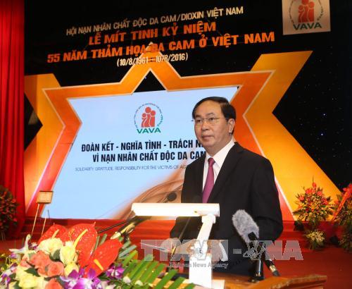 Chủ tịch nước Trần Đại Quang nhấn mạnh, những năm qua, Đảng và Nhà nước luôn quan tâm lãnh đạo, chỉ đạo, có nhiều chủ trương, chính sách giải quyết hậu quả chất độc da cam. Hằng năm, Nhà nước đã dành ngân sách hơn 10.000 tỷ đồng để trợ cấp hằng tháng, chăm sóc sức khỏe, hồi phục chức năng cho nạn nhân, hỗ trợ những vùng đặc biệt khó khăn do bị ảnh hưởng nặng nề của chất độc da cam. Kế hoạch hành động quốc gia khắc phục cơ bản hậu quả chất độc hóa học do đế quốc Mỹ sử dụng trong chiến tranh ở Việt Nam do Chính phủ ban hành đã được lồng ghép với các chiến lược, quy hoạch, kế hoạch, chương trình phát triển kinh tế - xã hội từ Trung ương đến địa phương, được cấp ủy, chính quyền các cấp quan tâm lãnh đạo, chỉ đạo tổ chức thực hiện và đạt được những kết quả quan trọng.